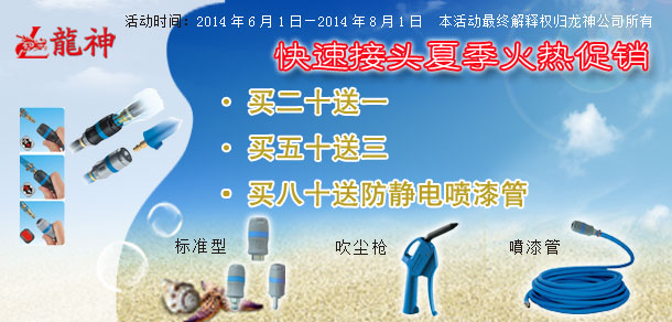 2014年6月法國佩釜標準快速接頭“爽一夏”讓利大促銷 2014-05-30 43230 1、買二十送一(即買二十個快速接頭送一個法國佩釜快速接頭或法國佩釜吹塵槍(編號:38016)一把) 2、買五十送三(即買五十個快速接頭送三個法國佩釜快速接頭或法法國佩釜吹塵槍(編號:38016)三把) 3、買八十送一卷防靜電噴漆軟管(編號:36323)