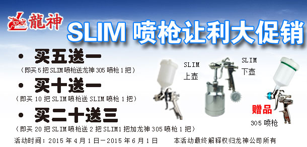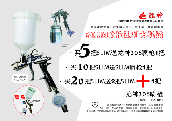 2014年2月份SLIM噴槍促銷方案 2014-02-14 10950 一、 主題“春雷。讓利行動”SLIM噴槍讓利大促銷二、 活動時間1、 起始時間:2014年02月15日至2014年4月15日2、 時長:二個月三、 活動內容(活動方案)1)買5把SLIM送 龍神305噴槍[編號3056001*]一把2)買10把SLIM送1把SLIM3)買20把SLIM送2把SLIM+送龍神305噴槍[編號3056001*]一把活動期間SLIM上下壺噴槍的贈送方式為:以多贈送原則(如:買6把上壺+4把下壺,贈送上壺。反之亦然,以此類推。)