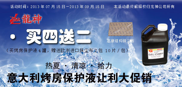 "熱夏 清涼 給力" 意大利烤房保護液讓利大促銷! 2013-07-16 25238 "熱夏 清涼 給力" 意大利烤房保護液讓利大促銷!活動時間:2013年07月15日至2013年09月15日。 時長:共計2個月