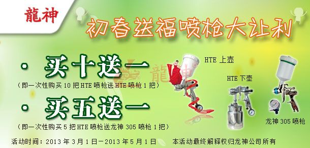 吉尼斯HTE噴槍“初春送?!贝黉N活動方案 2013-03-01 27821 吉尼斯HTE噴槍“初春送福”促銷活動方案 (產品編號:30282000-30286000) 2013年3月份市場促銷方案如下:一、主題:“初春送?!眹姌尨笞尷?。二、活動時間:1、 時間:2013年03月1日至2013年05月1日 2、 時長:共計2個月 三、活動內容:1、 買十送一(即一次購買十把HTE噴槍送一把HTE噴槍)2、 買五送一(即一次購買五把HTE噴槍送一把龍神305噴槍)四、具體操作方案 1、購買十把HTE噴槍送一把HTE噴槍 2、買五把HTE噴槍送一把龍神305噴槍 (以上二個方案具體促銷方式可按增量的形成搭配)