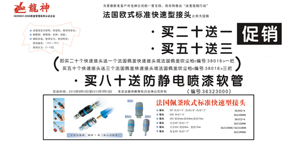 法國佩釜快速接頭“冰夏”讓利大促銷 2013-05-13 18568 法國佩釜快速接頭促銷方案(產品編號:36102000-36119000)一、主題:“冰夏”促銷行動 二、目的:回饋新老客戶,讓利大反饋 三、時間:1、 啟動時間:2013年5月13日 2、 結束時間:2013年7月13日3、 時長:2個月 四、活動內容:1、 買二十送一(即買二十個快速接頭送一個法國佩釜快速接頭或法法國佩釜吹塵槍(編號:38016)一把) 2、 買五十送三 3、 買八十送防靜電噴漆軟管(編號:36323)五、其它 1、本活動最終解釋權歸珠海龍神所有。