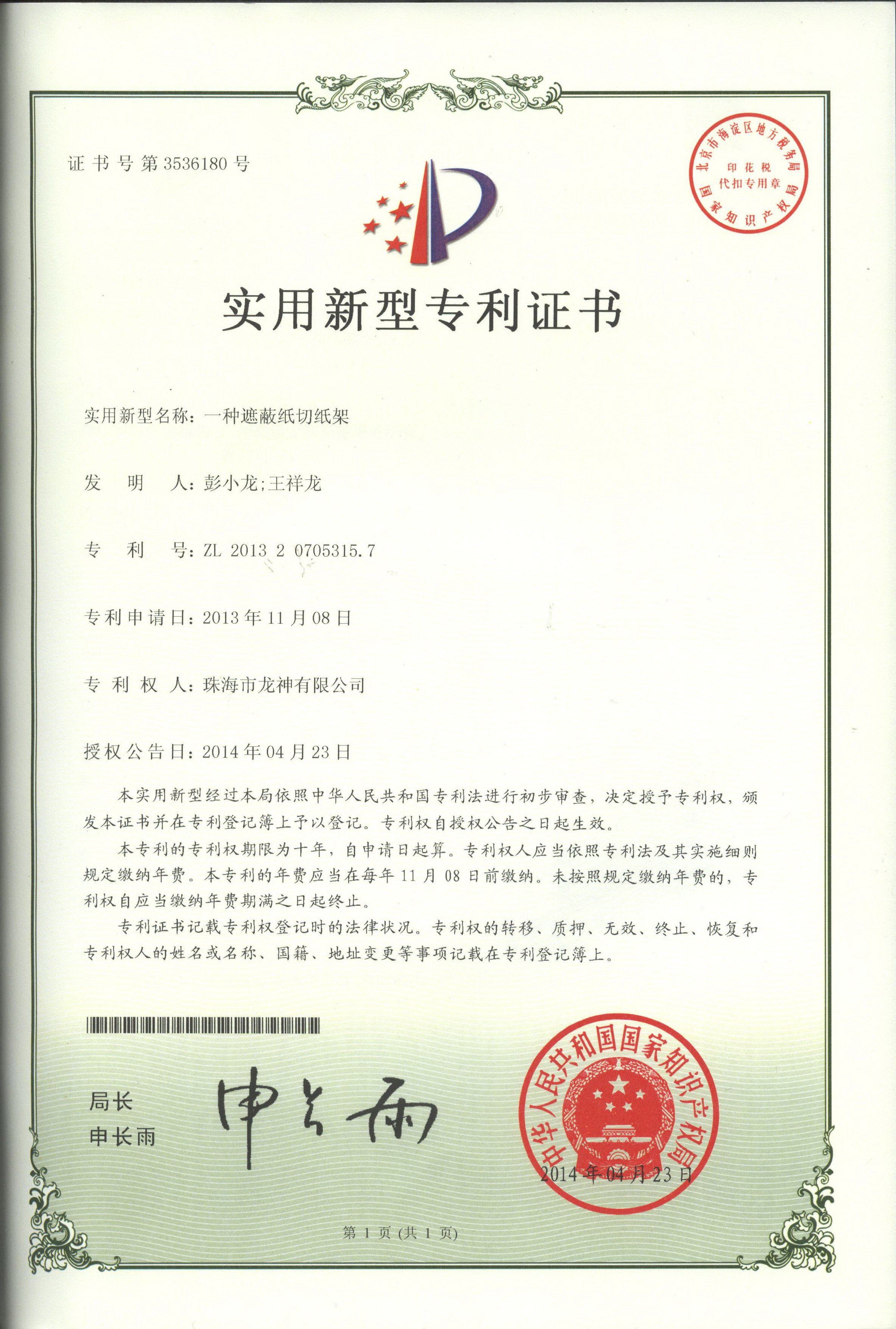 遮蔽紙切紙架專利證書 | ![]() 塊型拉拔鉤專利證書 |