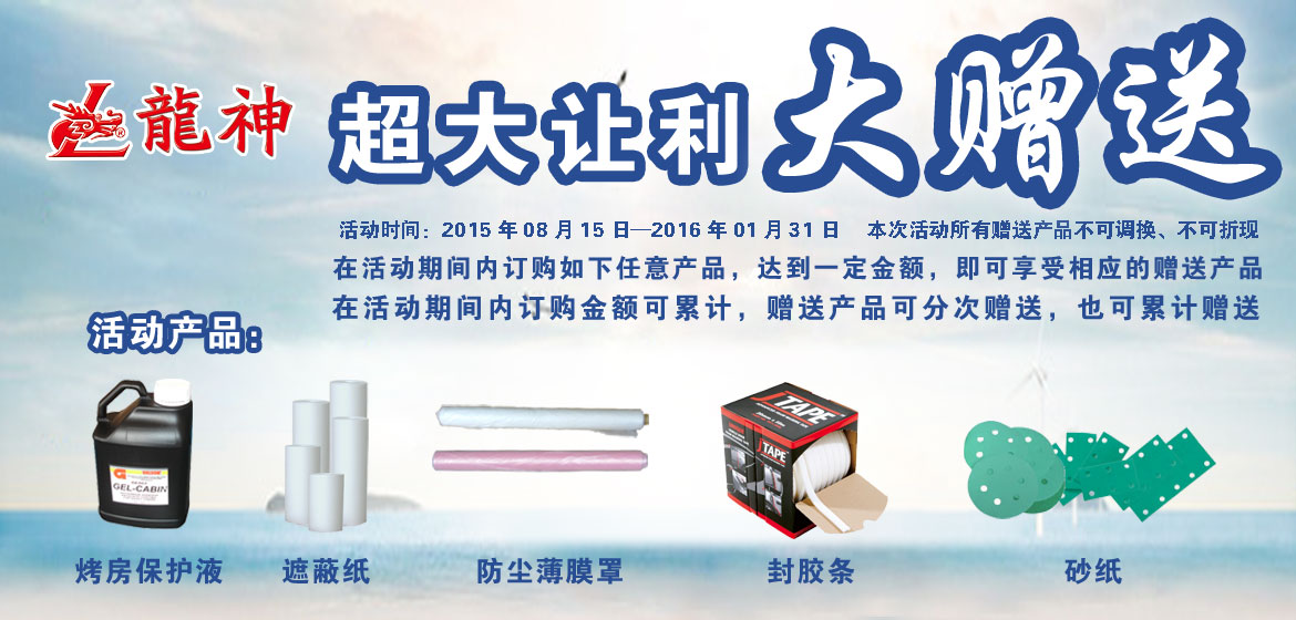 超大讓利﹒大贈送 2015-08-17 31680 訂購產品:1、烤房保護液; 2、遮蔽膜; 3、遮蔽紙; 4、泡沫膠條; 5、砂紙。 在活動期間內訂購如上任意產品,達到下表累計金額,即可享受相應的贈送產品。